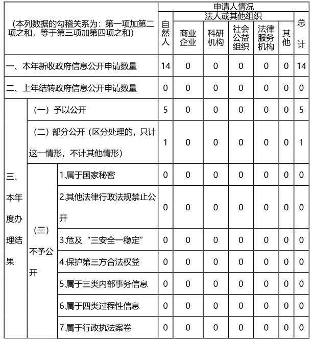 2023年,我局共受理14份政府信息公开申请,没有上年结转政府信息公开申请,均已保质保量予以答复,未收取申请人依申请政府公开信息费用。