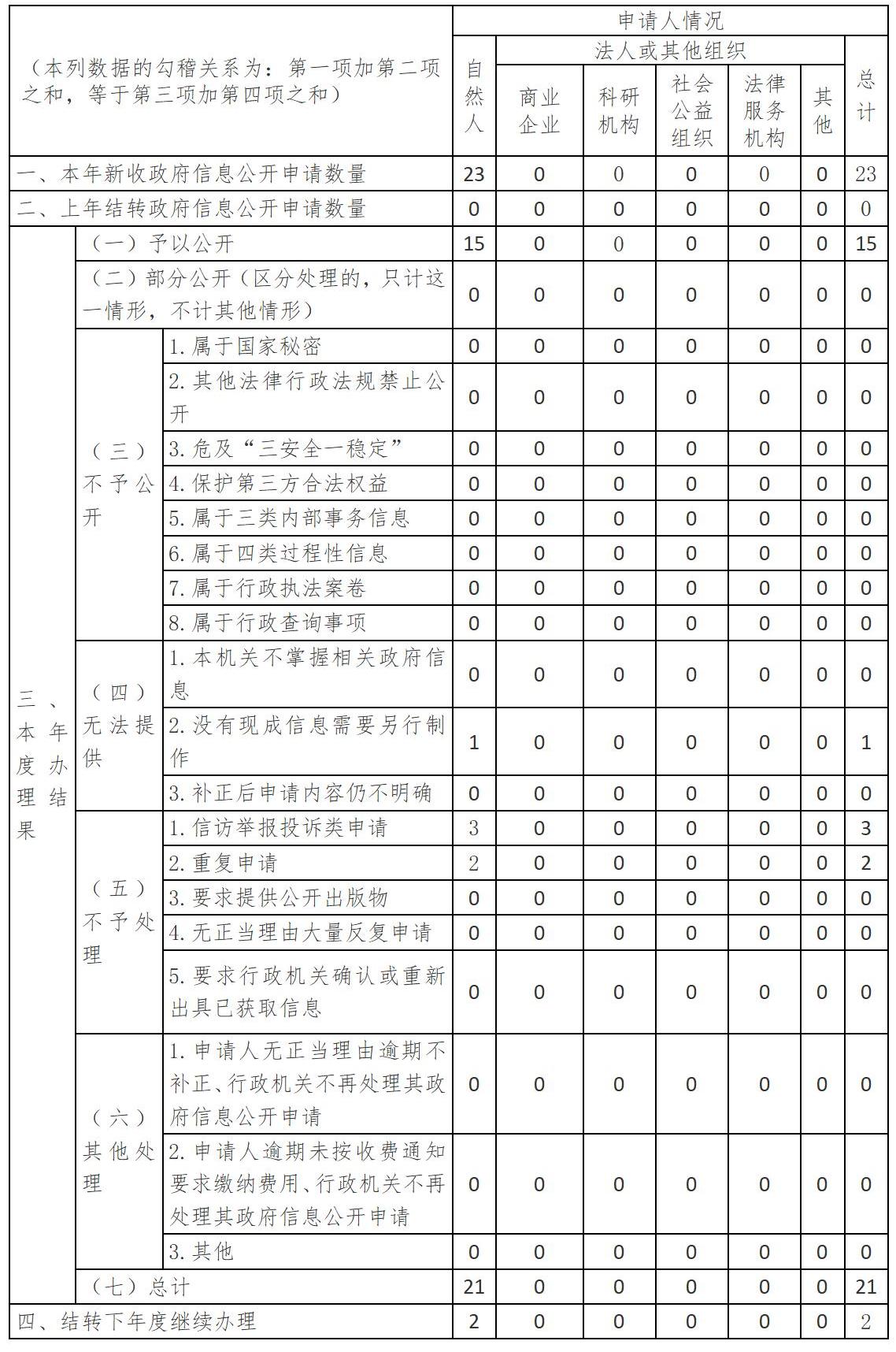 2024年,我局共收到政府信息依申请公开23件,其中重复申请的有2件,属于信访举报投诉类事项的有3件,16件按要求答复了申请人,2件结转下年度办理,没有发生因政府信息公开工作被申请行政复议、提起行政诉讼的情况。