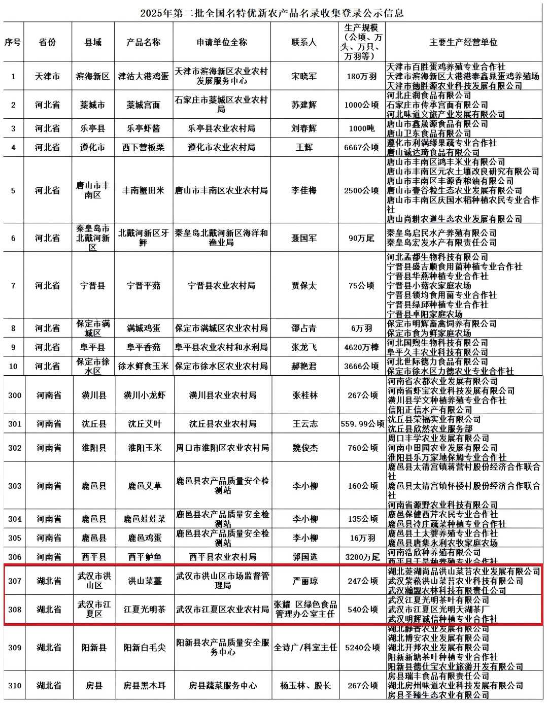 近日,农业农村部农产品质量安全中心对2025年第二批全国名特优新农产品进行公示,洪山菜薹和江夏光明茶成功上榜。