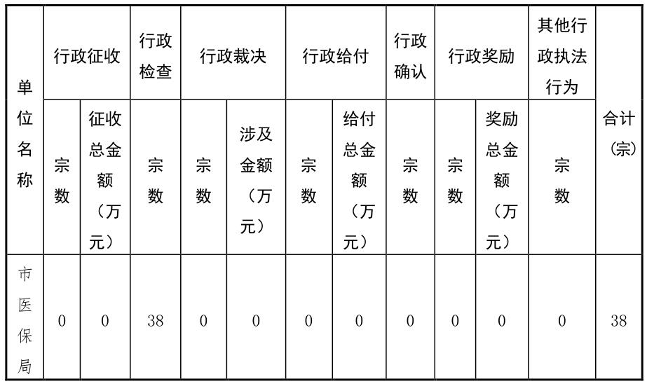 2023年,市医保局已公示年度执法检查计划、执法统计年报,共实施行政检查38件,其中局机关29件,二级单位9件,人均检查件数3.45件,检查合格率52.63%。未实施其他行政执法行为。