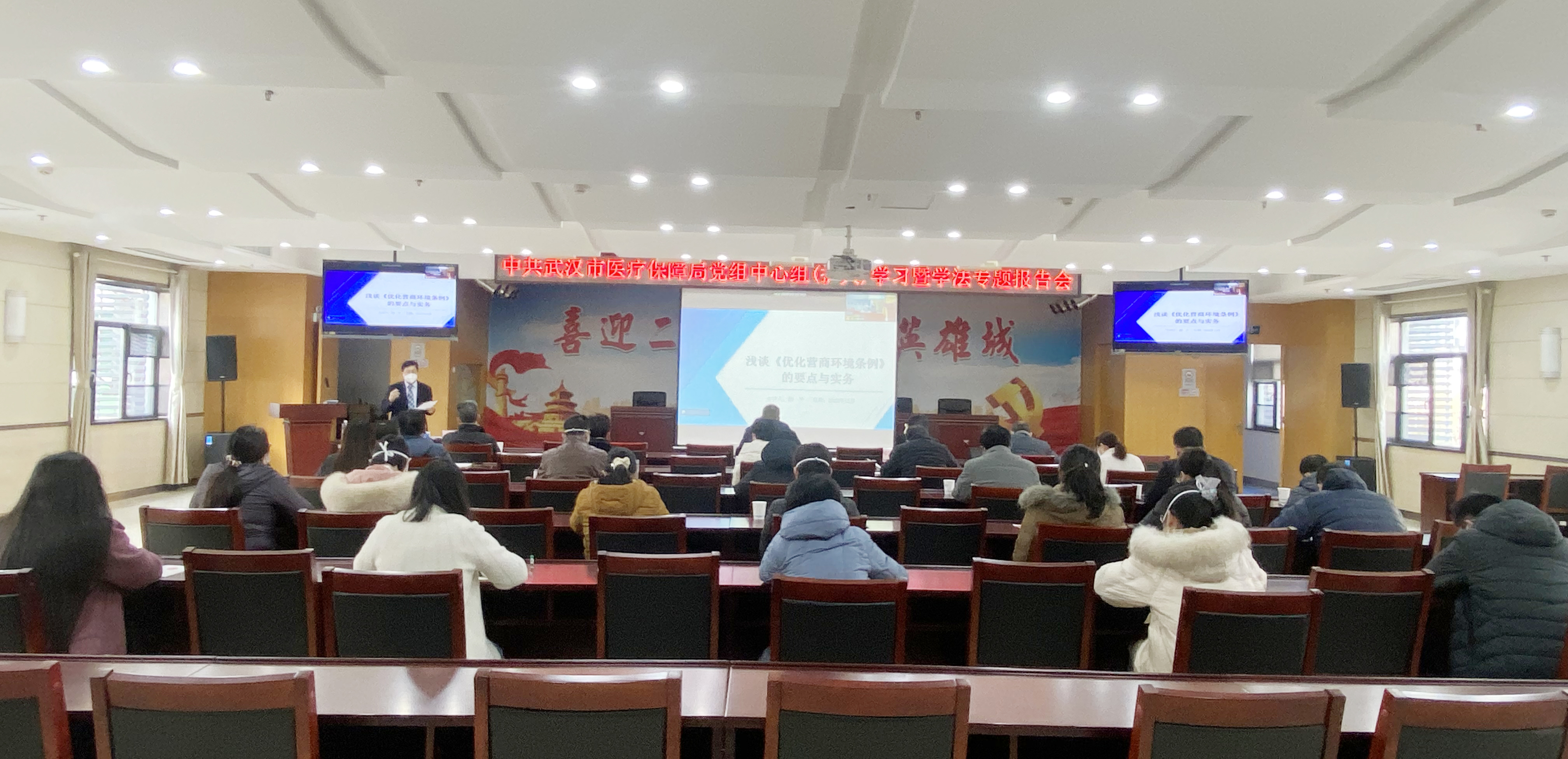 为深入贯彻习近平总书记“法治是最好的营商环境”的重要指示精神,提升优化营商环境法治意识,根据市委依法治市办相关要求和《武汉市医疗保障局2022年法制工作要点》安排,2022年12月29日下午,市医保局举办了党组中心组(扩大)学习暨学法专题报告会。会议邀请湖北瑞通天元律师事务所监事会主席柳平律师以“法治化营商环境”为主题对优化营商环境的法律制度和规定进行专题解读,局领导和局机关全体干部在主会场、市医保中心正科级及以上干部在分会场参加了会议。
