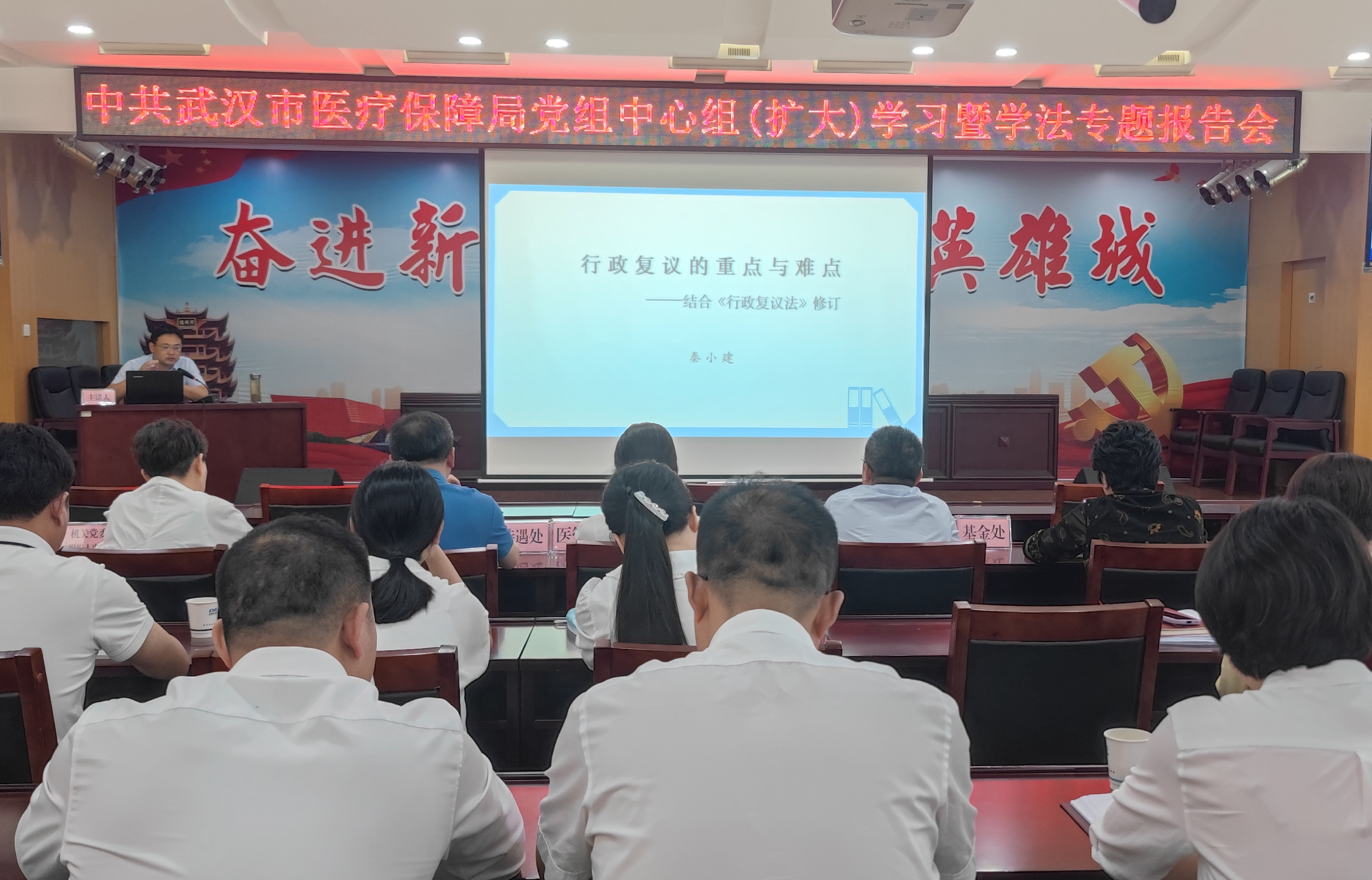 为认真贯彻落实习行政复议有关工作要求,深入学习、准确理解、严格执行行政复议法, 市医保局于2024年6月6日下午举办了党组中心组(扩大)学法行政复议法专题报告会,邀请中南财经政法大学秦小建教授对新修订的行政复议法进行专题解读,局领导、局机关全体干部和市医保中心正科级及以上干部参加了会议。