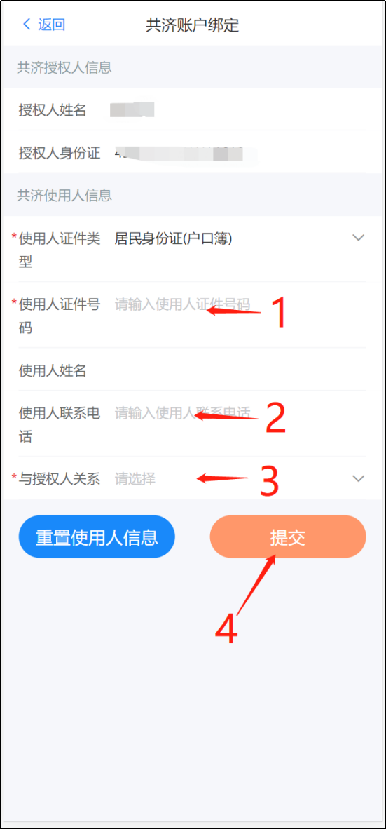 输入使用人的证件号码,可选填使用人手机号,选择与授权人关系,确认无误后点击“提交”按钮进行绑定。