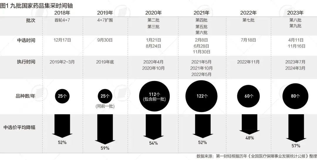 此后的集采批次中,只有第六批、第七批降幅略低于50%。今年11月6日开标的第九批药品集采中选品种平均降幅再升至58%,仅次于“4 7”扩围时的降幅。这九批国家组织药品集采平均降幅超50%。