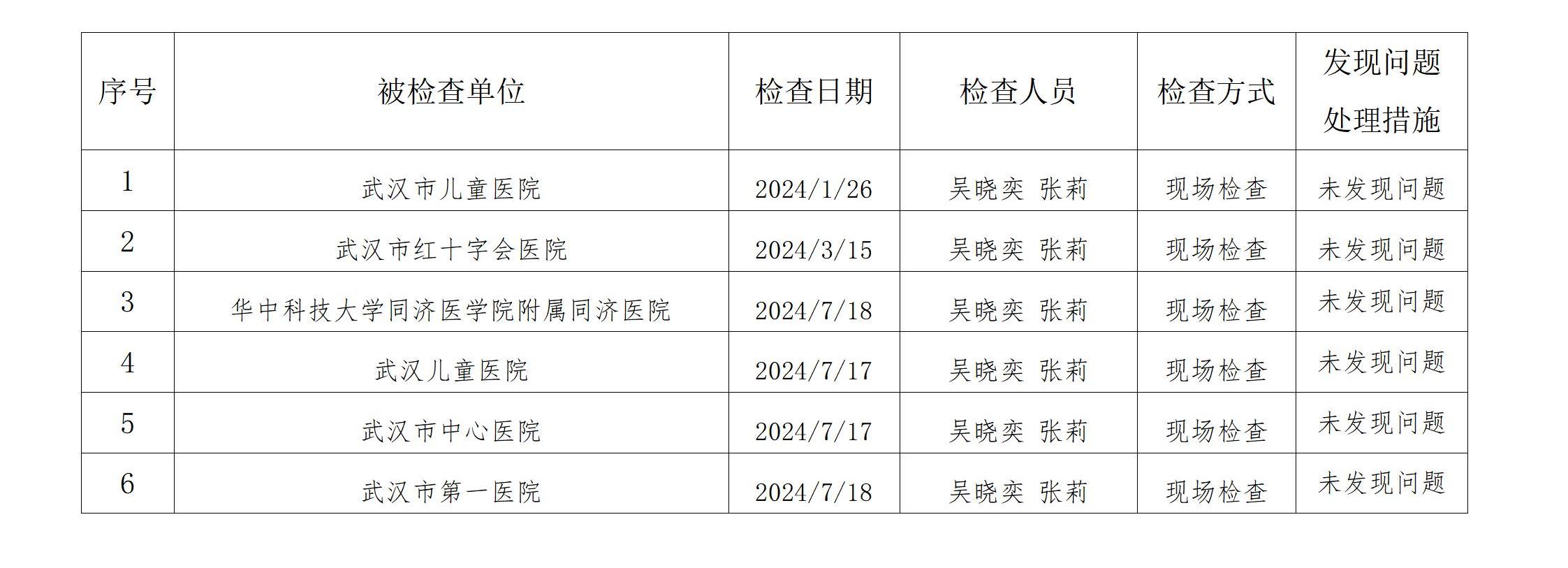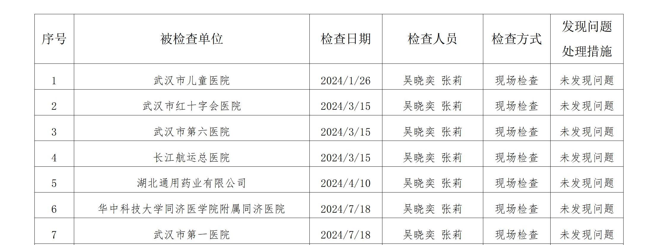 根据年度行政检查计划安排,2024年1月至12月20日,武汉市医保局对医药机构提供的药品、医用耗材实际购销价格和购销数量等资料的相关情况进行了抽查,现将检查结果公示如下: